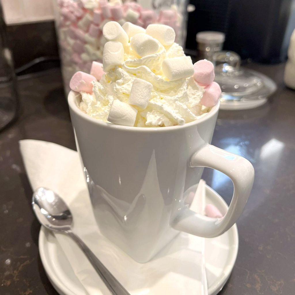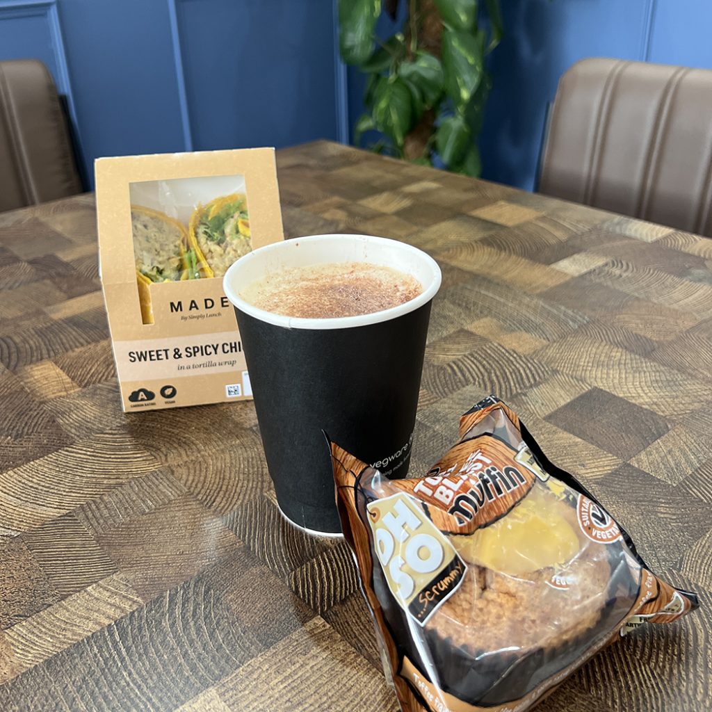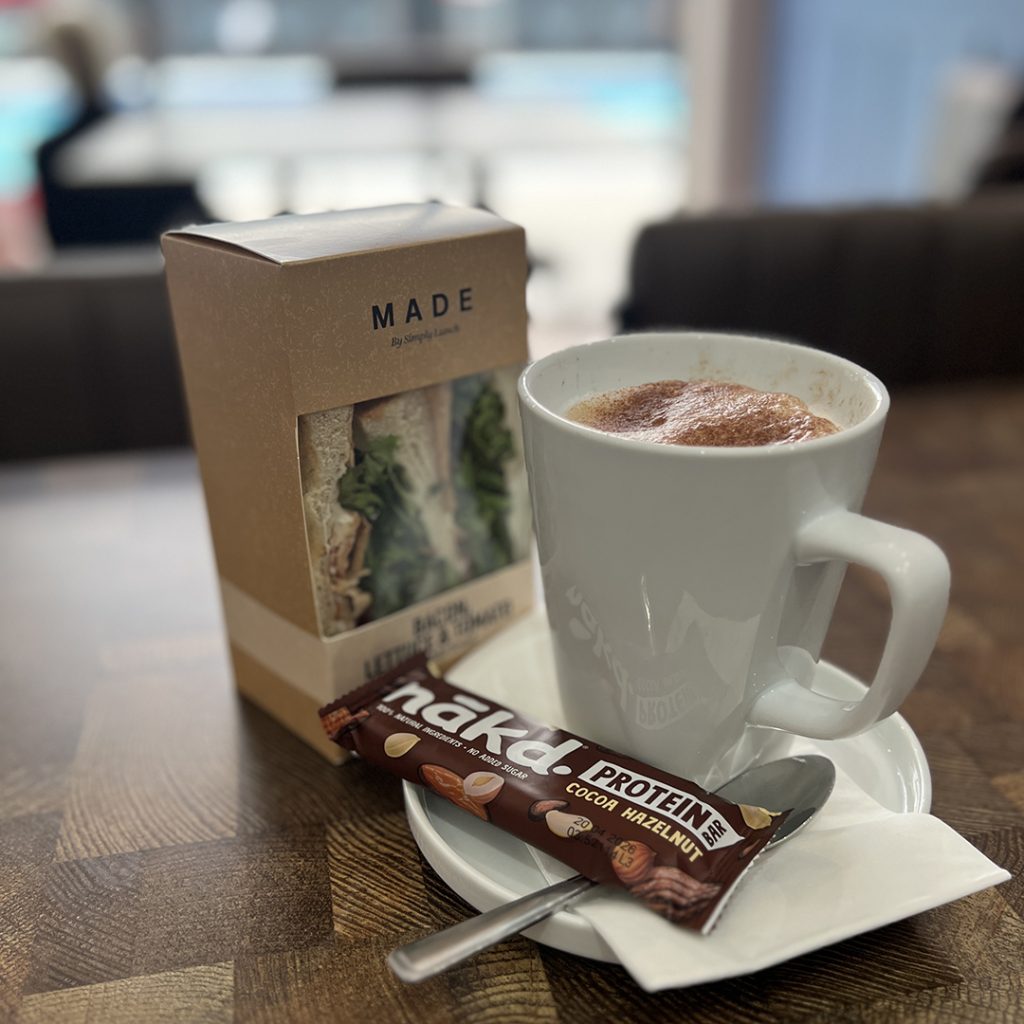 We’re serving a wide range of coffees, teas, soft drinks, pastries, sandwiches and snacks. Takeaway drinks available too.